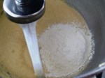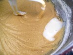 Bajar la velocidad de la batidora a mínimo y agregar los ingredientes secos previamente cernidos. Hacer esto en tres tandas, intercalando con el yogurt. Bueno, la receta es con sour cream, pero yo prefiero siempre reemplazarla con yogurt natural.