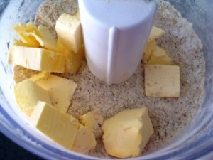 Cortar la mantequilla fría en cuadritos y mezclarla con los ingredientes secos. Hay que lograr que la mezcla quede como con grumitos, para mí es más fácil hacer eso en el procesador, pero se puede hacer con ayuda de un tenedor, o como hace Aran, ella pone la mantequilla a congelar y luego la ralla. Lo importante es no amasar, solo sobar con los dedos y así evitar que la masa se caliente.