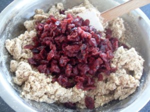 Luego agregar los cranberries. Recuerden que no hay que amasar, solo hay que tratar de que los ingredientes se unan.