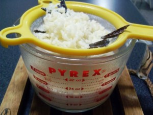 Pasada media hora de tener la leche a fuego bajo retirar y colar, aquí es cuando pueden poner esencia de vainilla si desean. El arroz lo pueden botar o se lo pueden comer. Lo importante en este caso es que la leche tenga el sabor del arroz con leche de su casa. Y listo, con esto completamos el primer paso.