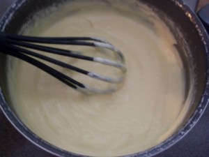 Luego regresar a la olla la mezcla de yemas y volver a la hornilla. Aquí no hay que distraerse, mientras la olla está al calor bajo hay que ir batiendo la crema con el batidor de mano. No se van a cansar porque por la cantidad de fécula espesará muy rápido y cuando eso suceda es porque ya está.