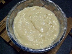 Vaciar la crema a un recipiente limpio, batir un poquito más pare bajarle la temperatura y luego cubrir con film. Ojo, el film debe quedar en contacto con la crema, de esa manera no se le formará costra. Refrigerar hasta utilizar. Y listo, con esto completamos el segundo paso.
