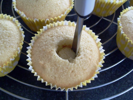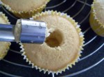 Ahora nos toca rellenar los cupcakes. Es fácil, si tienen ese aparatito para sacar el centro de la manzana (me parece cruel usar el término descorazonador) pues lo usan para hacer el hueco en cada cupcake. Simplemente lo introducen en el centro del cupcake y presionan hacia abajo, traten de que no se vaya hasta el fondo. Luego lo retiran y listo, verán que el cupcake tendrá un huequito perfecto. Reserven lo que han retirado de los cupcakes, todavía no se lo coman.