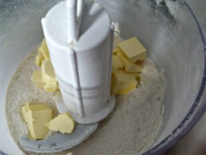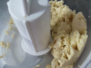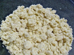 Ahora hagamos la masa. Procesar la harina de arroz, harina de linaza y la mantequilla muy fría en cuadritos hasta tener una consistencia de avena. La receta lleva miel, pero no le puse porque me pareció que quedaría muy dulce. Otra cosa, como la goma xanthan no se consigue por estos lares, la reemplacé por harina de linaza. La harina de linaza así como las semillas de chía son el mejor sustituto para este ingrediente.