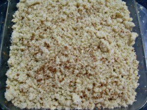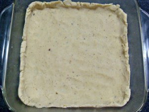 Retirar y colocar en un molde cuadrado de 18 centímetros, engrasado. Presionar con los dedos para cubrir toda la base y un poco de los bordes. La textura de la masa hace difícil estirarla con un rodillo, pero es perfecta para darle forma dentro del mismo molde. Refrigerar.