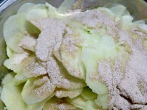 7. Pelar las manzanas, sacarles el corazón y cortarlas en rebanadas muy finas. Mezclar las manzanas con la mezcla de azúcar y colocarlas dentro del molde forrado con la masa.