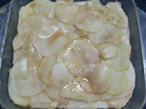 Retirar el molde de la refri y rellenar con las manzanas. Procuren que quede parejo, cuidando de poner manzanas en los bordes y las esquinas. Si queda algún jugo en el tazón donde estuvieron las manzanas, se lo ponen también.