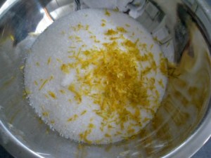 Así que vamos con la receta. Lo primero que vamos a hacer es saborizar el azúcar con la cáscara de naranja. Para eso en un tazón deberán colocar el azúcar con la ralladura de naranja, luego con las manos sobar ambos hasta que se sienta el olor a naranja y el azúcar esté como más húmeda.
