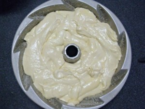 Verter la masa en el molde engrasado y enharinado. Yo le puse grasa en spray y además lo espolvoreé con pan rallado, lo hice así porque me gustó el resultado que tuve cuando hice el bundt cake de limón, kion y pimienta.