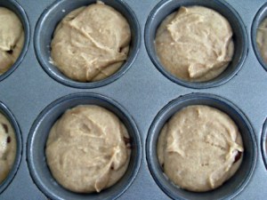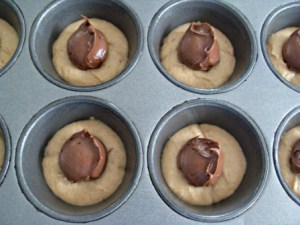 Repartir una buena cucharada de la masa en la base de cada molde, luego agregar una cucharadita de Nutella en cada uno y finalmente agregar otra cucharada de masa para tapar la Nutella. Los moldes están engrasados con grasa en spray, pero si ustedes quieren, pueden ponerles pirotines o engrasarlos con mantequilla.