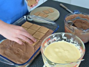 Ahora pongan una capa de galletas de vainilla y luego una capa de pudín de chocolate. Luego otra capa de vainilla y de pudín de vainilla. Y así sucesivamente, intercalando los sabores del pudín. Ahora bien, pueden usar solo un sabor de pudín si quieren, pero a mí me gusta con los dos.