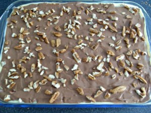 Al final terminan con pudín de chocolate. ¿Por qué con el de chocolate? Pues porque me gusta, en verdad pueden terminar con el sabor que quieran. Como un toque de decoración le pusimos un poquito de pecanas picadas, si quieren le ponen o si quieren le ponen coco rallado o incluso las galletas trituradas, o nada. Cubrir el molde con film y refrigerar hasta el día siguiente.