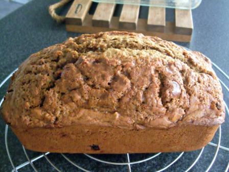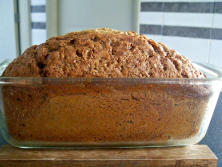 Ah, un punto importante a tomar en cuenta. Yo usé un molde un poquito más pequeño que el que decía en la receta, usé el molde rectangular de Pyrex que mide 8 ¼ pulgadas de largo, y la receta decía que use uno de 9 ¼, no le di importancia y usé el de siempre. Si bien el usar el molde pequeño le dio un efecto espectacular porque se veía que había crecido, creo que la concentración de la masa hizo que en el fondo quedase como si no se hubiera terminado de cocinar. Igual quedó buenazo.