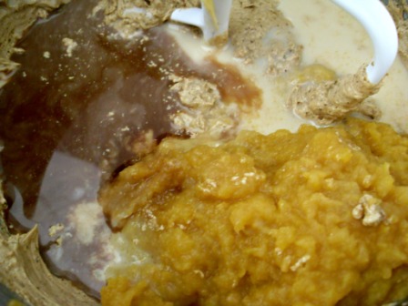 Ahora agregar la leche, puré de calabaza y vainilla y batir. Uy, la masa se corta, se corta terriblemente, pero no se preocupen, cuando le pongamos los secos se arreglará, así que no se desesperen y no piensen que su masa se arruinó.