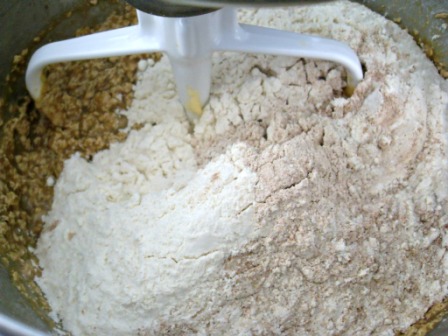 Cernir la harina junto con el polvo de hornear, bicarbonato, sal, canela, jengibre y nuez moscada. Bajar la velocidad de la batidora y agregar los ingredientes lo ingredientes secos. Mezclar hasta integrar.