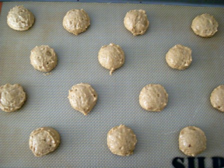 Listo, la masa les quedará pareja (ya no se verá cortada), pero eso sí, es algo floja, tiene la consistencia como la masa de un queque. Para formar las galletas tendrán que poner la masa en una manga pastelera adaptada con una boquilla redonda y lisa, con ella hacer bolitas de masa de más o menos 1 ½ pulgadas de diámetro. A mí me dio mucha flojera usar la manga así que usé la cucharita para servir helados. ¿Cuál es la diferencia? Con la manga y boquilla les saldrán más perfectas, con la cucharita no quedarán tan redonditas. Ah, la placa debe estar forrada en papel manteca o con silpat.