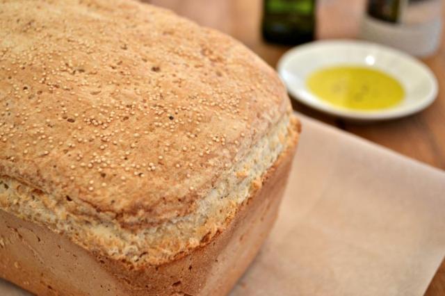 Si bien sabía que debía bajarle la cantidad de levadura seca, preferí esta vez hacer otra receta, y una que ya había visto pero que no podía hacer porque no tenía levadura para pan sin gluten, ingrediente primordial en la receta. Y saben algo, la receta era nada más y nada menos que de Jamie Oliver, creo que solo por eso la guardé entre mis pendientes para hacer. Ahora bien, se supone que debería haberle dado forma de pan y no hacerlo en molde, pero la masa me quedó bastante suelta y no me iba a aventurar a ponerle más harina, así que la solución ideal fue meterla en el molde de pan, y quedó perfecto.