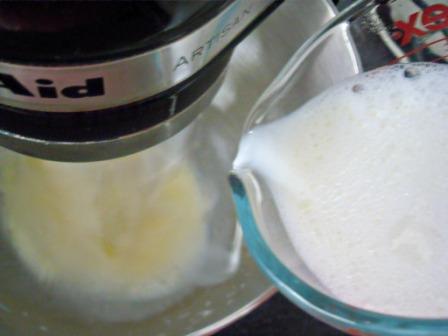 En un tazón batir los huevos con el vinagre e ir agregando la leche tibia.