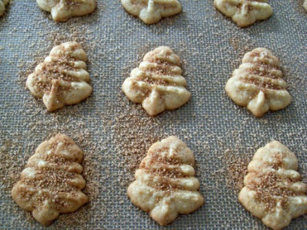 - Colocar una parte de la masa en la pistola para galletas, adaptada con la plantilla de árbol de Navidad y dar forma a las galletas sobre las placas con silpat.