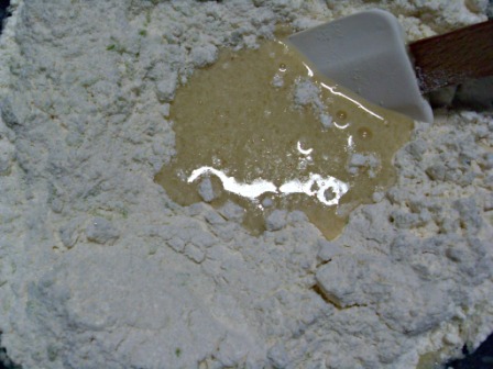 Vaciar la mezcla de los líquidos a los ingredientes secos y con una espátula mezclar hasta que no queden rastros de harina. La masa quedará bastante líquida.
