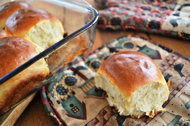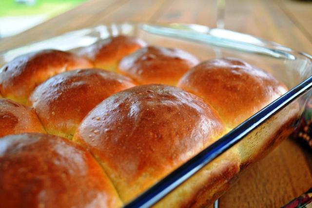 La receta original es de Kelsey Nixon y la pueden encontrar en Cooking Channel. Para este post hice la mitad, 12 panes es perfecto, además que salen de buen tamaño. La receta es muy buena salvo la cantidad de harina, bueno, dice entre 4 y 6 tazas, y para hacer la mitad de la receta usé 3 tazas y un poco más: puse 2 cucharadas más mientras se amasaba en la batidora y como 2 cucharadas más cuando amasé en la mesa.