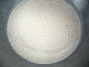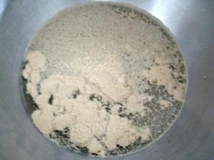 Para que vean que no son complicados de hacer. En el tazón de la batidora disolver la levadura seca con el agua tibia (105°F/34°C) y dejar reposar 5 minutos. Verán que pasado ese tiempo (o un poquito más), hay burbujas y el agua se convierte como cremosa.
