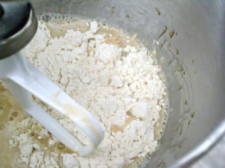 Bajar la velocidad de la batidora y agregar la harina taza por taza. Batir hasta que se desprenda de las paredes del tazón. Aquí es donde le puse un par de cucharadas más de harina.