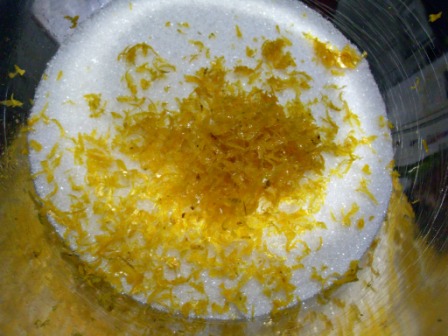 En un tazón colocar el azúcar con la ralladura de naranja y frotar hasta que la naranja suelte todo su olor y el azúcar se sienta húmeda.