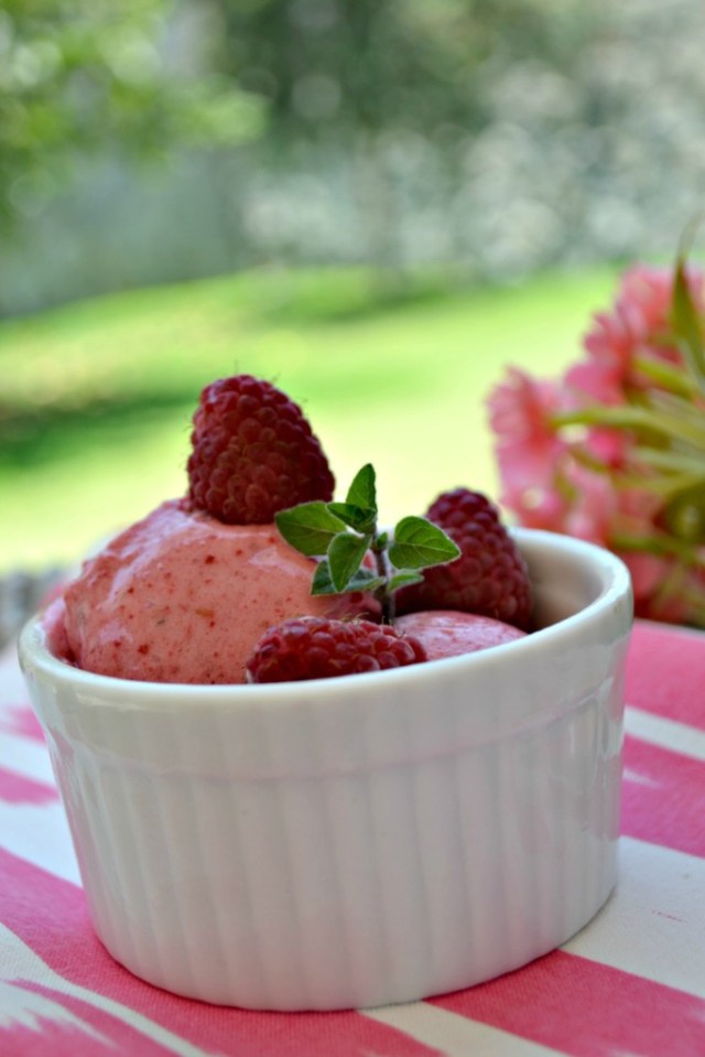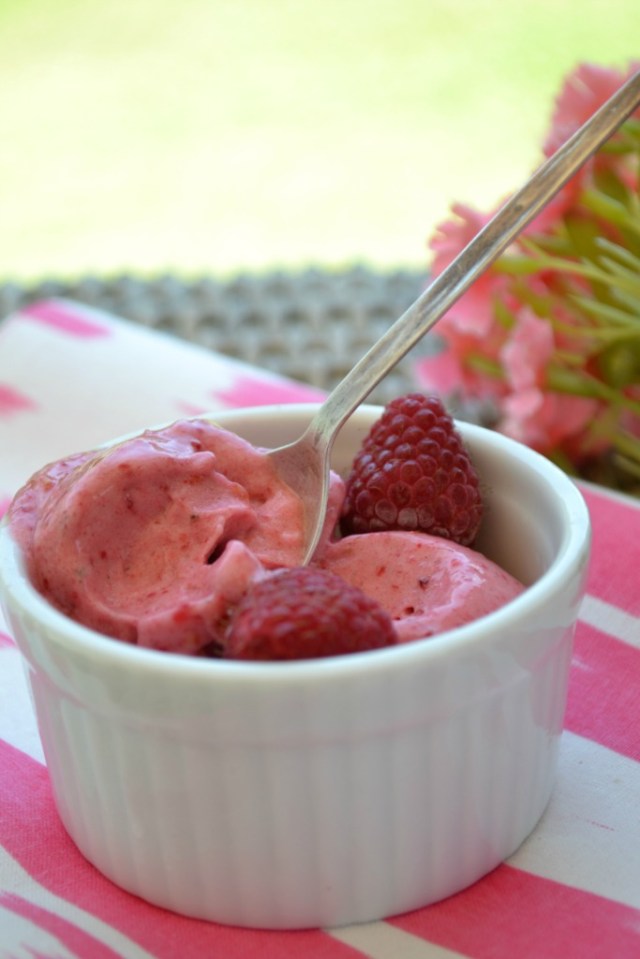 Muy bien, el secreto está en el plátano. Sí, lleva plátano y resulta que es el sustituto ideal de la crema leche, las yemas y el azúcar. ¿Qué más lleva? Bueno, en este caso frambuesas, pero le pueden poner fresas, mango, lúcuma, lo que quieran. Lo ideal es que sea una fruta de sabor intenso para opacar al plátano y sobre todo, que esté congelada.