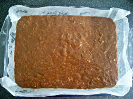 Vaciar la masa en el molde rectangular de 9 x 13 pulgadas, el cual deberá estar engrasado y con papel manteca engrasado.