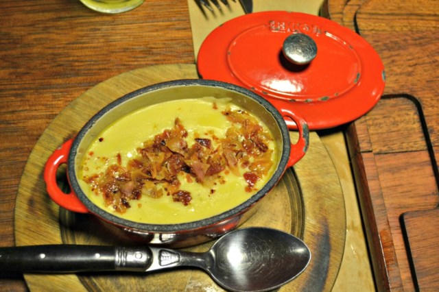 No encontrarás manteles blancos decorando las mesas, estas están cubiertas con papel craft, tendrás secadores en lugar de servilletas, el plato principal es una gran tabla de picar y la vajilla es de fierro enlozado y hierro fundido, algunas algo desvencijadas, que en otro restaurante dejarían mucho que desear, pero que en este lugar lo puedes aceptar.