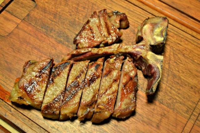 Como plato de fondo, o mejor dicho, corte de carne principal, inicialmente pedimos Bife ancho, pero solo había nacional y Wagyu. No nos quisimos mandar por el primero y el segundo era demasiado caro. Decidimos entonces por el T-bone, esta carne solo viene en Angus y está madurada igualmente por 21 días. Lo peculiar de este corte es que tiene atravesado un hueso en forma de T, dividiendo la carne en dos tipos diferentes. Ojo, si te comes un T-bone normal a la parrilla o frito, quizás no logres sentir mucho la diferencia, pero el que sea una carne madurada creo que repotencia su sabor y al tener un lado más grasa que el otro, pues es entonces cuando te das cuenta de lo que comes. Fue un acierto pedirlo y aquí entre nos, me gustó mucho más el lado con más grasa.