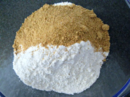Miren lo fácil que es de hacer. En un tazón mezclar la harina preparada con la panela. Si no tienen harina preparada, le ponen la harina común y además 1 cucharada de polvo de hornear (ya sería 4 ingredientes y no 3). Y sí, pueden usar azúcar blanca en lugar de la panela.