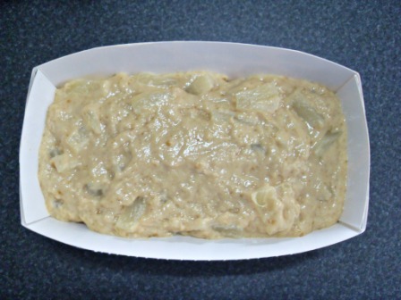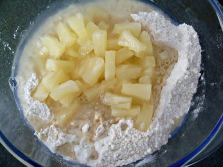 Agregar la piña y el jugo y mezclar. Miren, la receta dice que hay que usar una lata de 440 gr. Si es que el contenido de la suya es un poco menos, completan el peso con agua. Si por el contrario, pesa más, usen todo el jugo y la fruta necesaria para llegar al peso. Ah, les aviso que la masa queda bien consistente, así que tarda un poquito en que todos los ingredientes se unan.