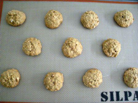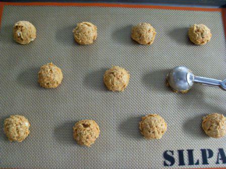 Con ayuda de una cuchara dejar caer la masa en una placa para horno, separando bien las galletas. Yo uso una cucharita pequeña de helado para hacer mis galletas, me facilita la vida. Si quieren pueden presionar un poco la masa para que las galletas no les queden tan gorditas.