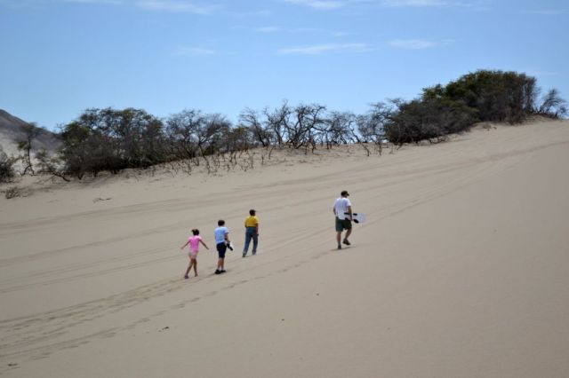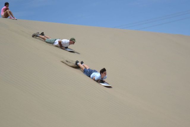 En Nazca hay lugares donde te alquilan las tablas. Nosotros contratamos un guía, quien nos proporcionó las tablas y nos llevó a un lugar tranquilo para que los chicos y mi esposo se llenen de arena. No, yo no, alguien tenía que tomar las fotos…ja,ja,ja…