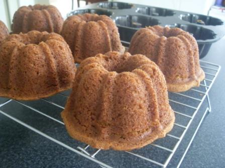 Hornear en horno precalentado en 350°F/180°C por 20 – 30 minutos (40 – 50 minutos si es un molde grande), hasta que al meter el probador, este salga limpio. Retirar del horno y dejar entibiar por unos 10 minutos, luego darle una sacudida muy delicada para asegurarnos que se han desprendido del molde y desmoldar sobre una rejilla.