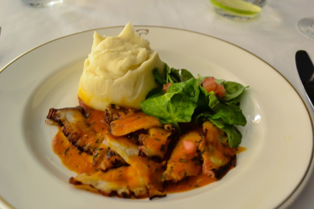 Les cuento entonces lo que comimos. Una de las entradas que pedimos fue el pulpo parrillero al carbón con berros y tomate en concassé y puré de pallares. Lo pedí la verdad con un poquito de temor porque a veces pasa que el pulpo no está bien cocido o por lo menos no como a mí me gusta, pero este estuvo preciso, nada duro, nada chicloso. Tenía un rico sabor a parrilla, con lo que me encanta la parrilla.