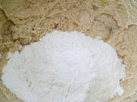 En un tazón cernir la harina con el polvo de hornear, bicarbonato y sal. Bajar la velocidad de la batidora y agregar la mitad de la harina. Batir solo hasta integrar, no más, con esto la masa ya se habrá arreglado.