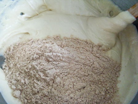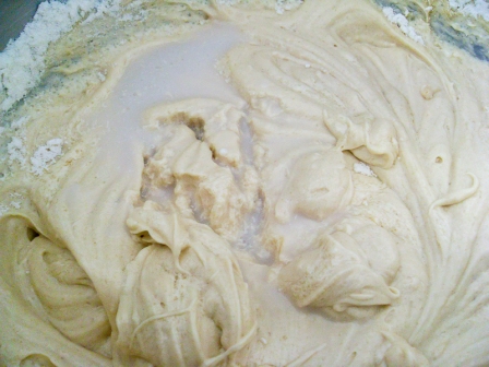 Cernir la harina, polvo de hornear y sal. Bajar la velocidad de la batidora a mínimo y agregar los ingredientes secos en 3 tandas, alternando con 2 tandas de leche de almendras. La receta original es con agua, pero preferí usar leche de almendras.