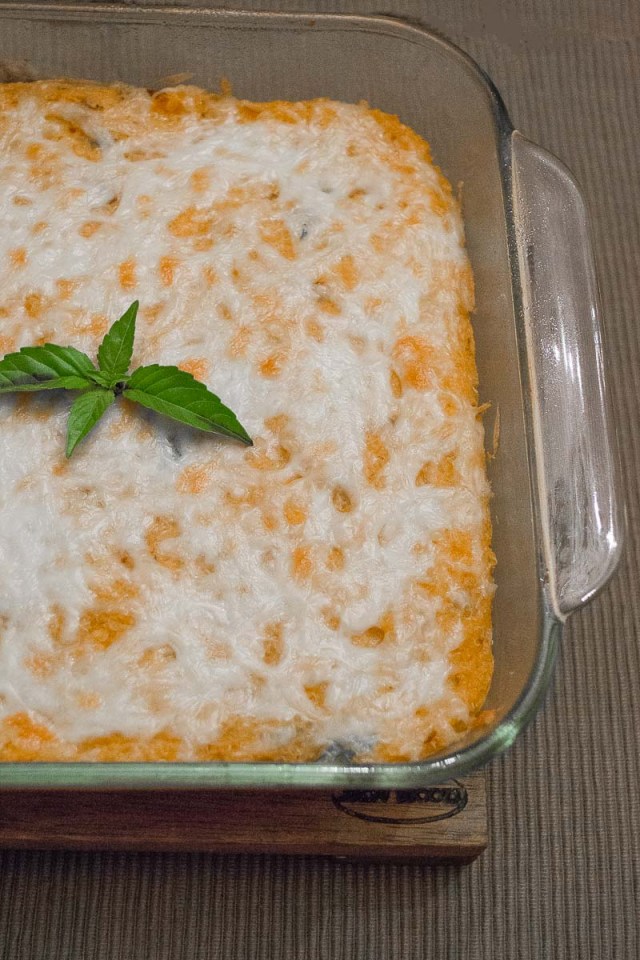 8. Vaciar la mezcla en el molde, cubrir con mozzarella y hornear por 15 minutos, luego encender el broil y dejar que gratine.