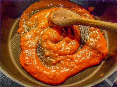4. En una olla calentar el tuco, agregar la crema de leche y mover bien.