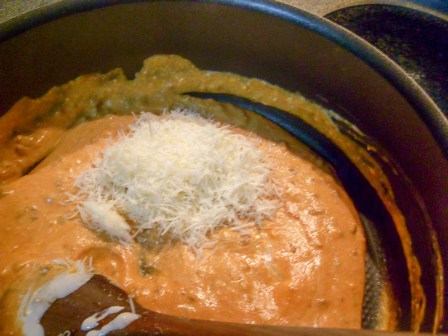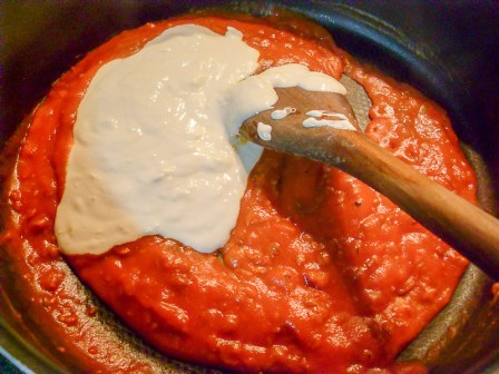 Cuando la salsa haya calentado (no es necesario que hierva), agregar la crema de leche. Pueden usar crema de leche regular o baja en calorías, o si prefieren una vegetal, como la de arroz.
