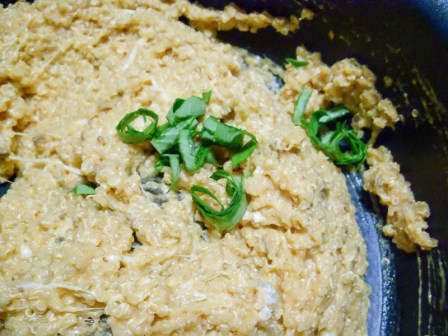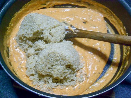 Cuando todo está integrado y caliente, agregamos la quinua cocida y movemos bien. En este punto el queso ya debe estar derretido y quizás se les haga un poco pesado mover todo, pero así es, debe quedar una mezcla espesa.
