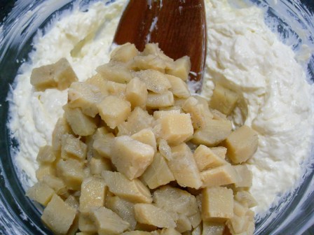 Agregamos los corazones de alcachofa cocidos y cortado en cuadritos y mezclamos. No hace falta que lo hagan con cuidado, puede ser que algunos cuadritos se deshagan, está bien, pero eso sí, deben asegurarse que queden algunos trozos, para que al momento de comer el dip se puedan ver los trocitos de alcachofa.