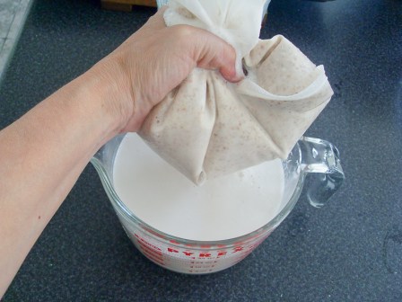 Si usan una bolsa para leches vegetales o una tela para queso, entonces cerrar bien y retorcer con fuerza para exprimir todo el líquido de la pulpa.