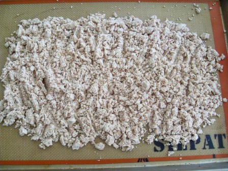 Hornear a la temperatura más baja que tenga su horno por más o menos dos horas. La temperatura más baja de mi horno es de 170°F/75°C, si el de ustedes es más alta, entonces pueden hornear con la puerta ligeramente abierta. Lo que queremos es secar la pulpa.