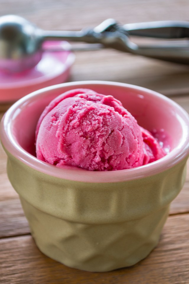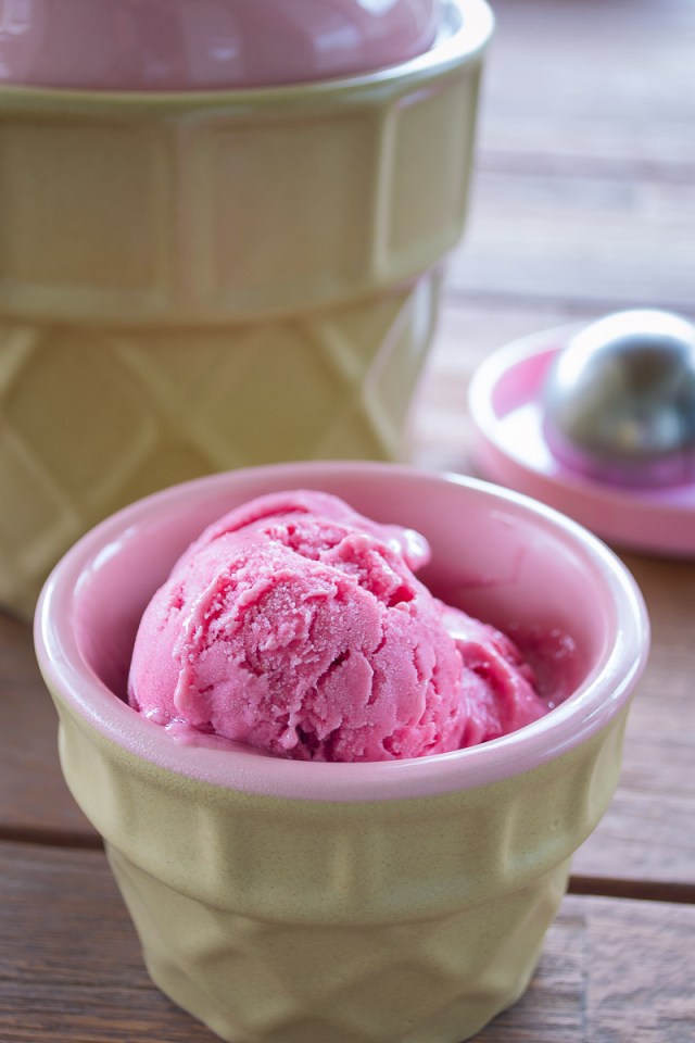 Ahora bien, para hacer este helado uso la máquina de helados, sin embargo puede no ser necesaria si usan fruta congelada, porque en ese caso cuando lo procesan verán que ya sale con consistencia cremosa. En el caso de esta receta, como se debe colar porque las frambuesas tienen pepitas muy duras, es mejor hacerla con la fresca, por eso se hace necesario la máquina del helado.