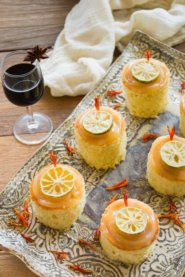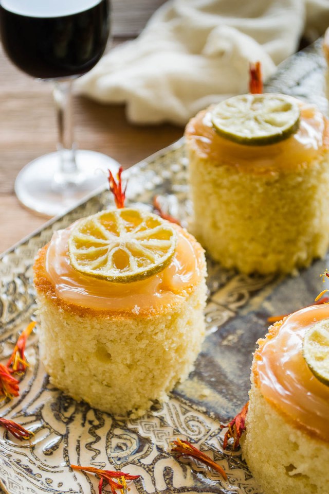 - Decorar cada quequito con curd de limón o pincelar con almíbar de limón y poner encima una rodaja de limón confitado.