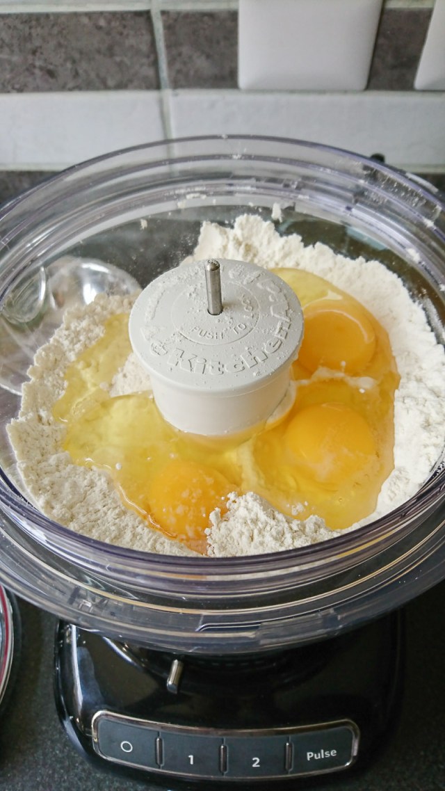 Yo uso el procesador para mezclar la harina con los huevos porque me resulta más práctico, proceso hasta que se forme una bola de masa. Pero no es necesario, pueden poner la harina y los huevos en la mesa y van uniendo todo hasta obtener una masa firme.